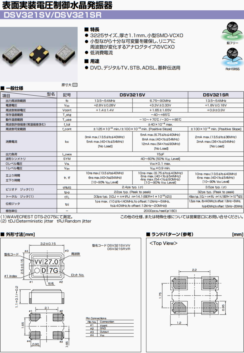 1XVD059928VA,DSV321SV,59.9285MHZ,日本KDS晶振,1XVD059928VA有源壓控晶振,四腳貼片晶振.日本KDS進口晶振,特點:3225尺寸,厚度1.1mm,小型SMD-VCXO,小型但確保足夠的可變量,頻率線性變化的模擬型VCXO,低耗電流,用途:DVD、數字電視、STB、基礎傳輸用,貼片晶振本身體積小,超薄型石英晶體振蕩器,特別適用于有目前高速發展的高端電子數碼產品.